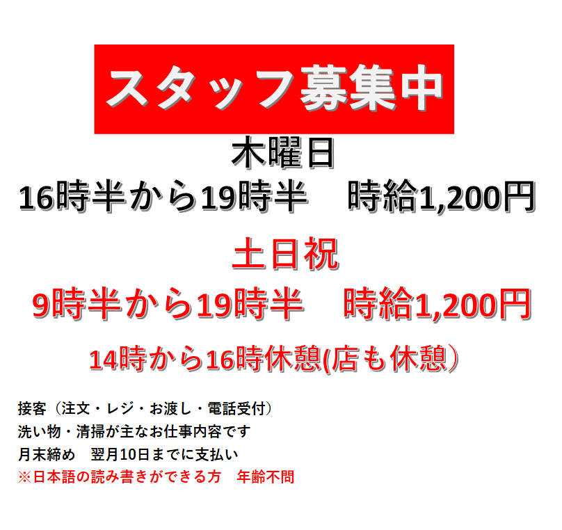 店休日予定・告知など 2025.10.162025.11.17 目次 告知毎週火曜日限定11月17日~11月23日の週替丼11月の営業予定スタッフ募集12月の予定 告知 毎週火曜日限定 11月17日~11月23日の週替丼 11月の営業予定 毎週水曜日は店休日です。※16日日曜日は人手不足で休業予定です。 14時~16時は仕込み休憩です。 スタッフ募集 12月の予定 12月29日まで営業予定です。 12月30日から1月2日まで休みます。